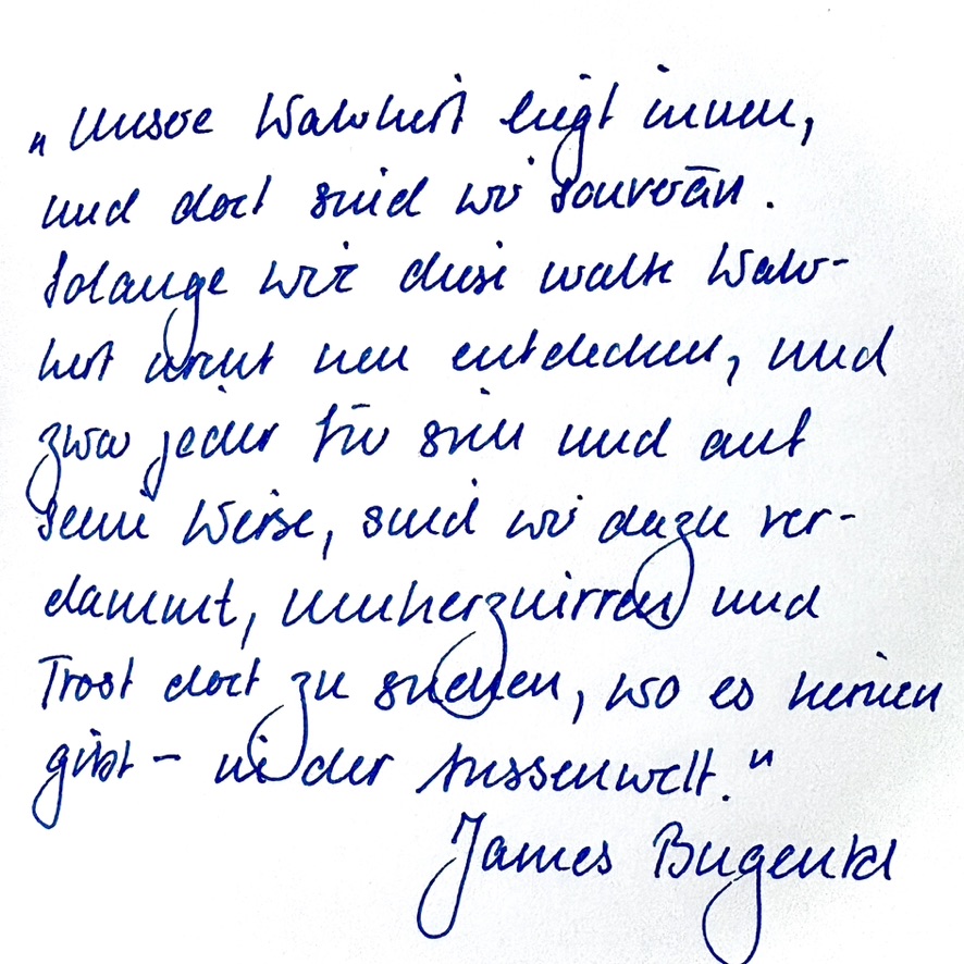 „Unsere Wahrheit liegt innen, und dort sind wir souverän. Solange wir diese uralte Wahrheit nicht neu entdecken und zwar jeder für sich und auf seine Weise, sind wir dazu verdammt, umherzuirren und Trost dort zu suchen, wo es keinen gibt – in der Aussenwelt.“ James Bugental