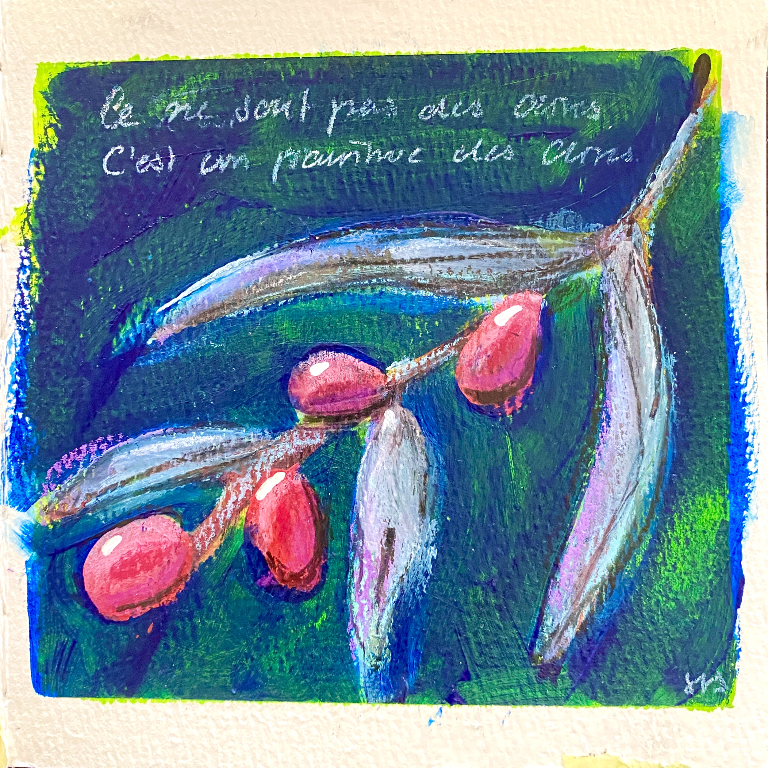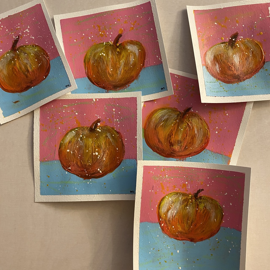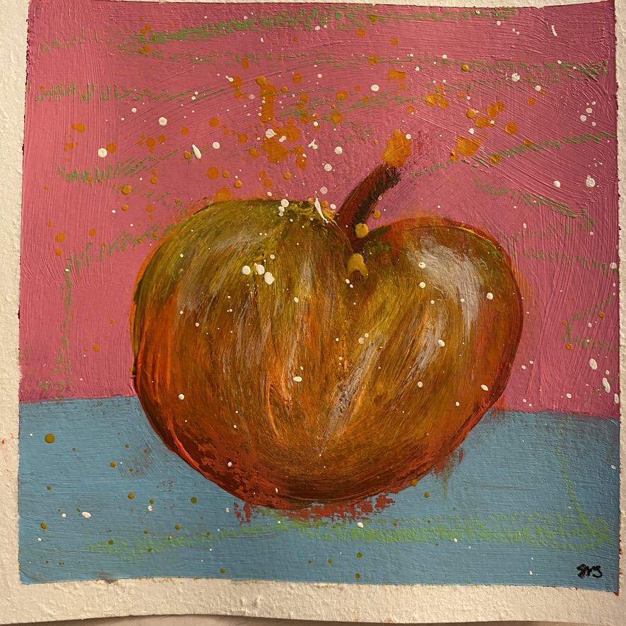 Nun sind es immerhin zwei Äpfel, doch ohne Sine und ohne Reim, aber wie heisst es so schön: A apple a day keeps the doctor away – und: doppelt gemoppelt hilft bekanntlich besser. Der Apfel ist Teil einer Sechser-Serie, ich mag es Serien zu malen, die das gleiche Motiv auf ähnliche Weise aufnehmen und doch unterschiedliche Ergebnisse abgeben.