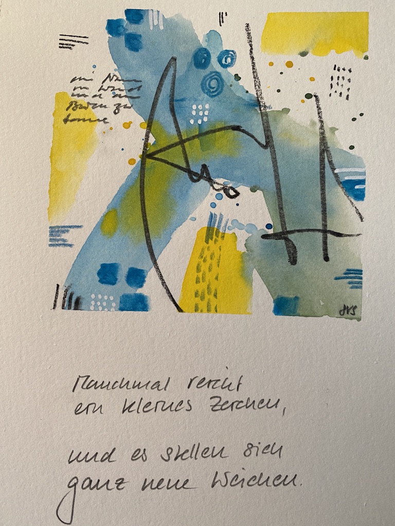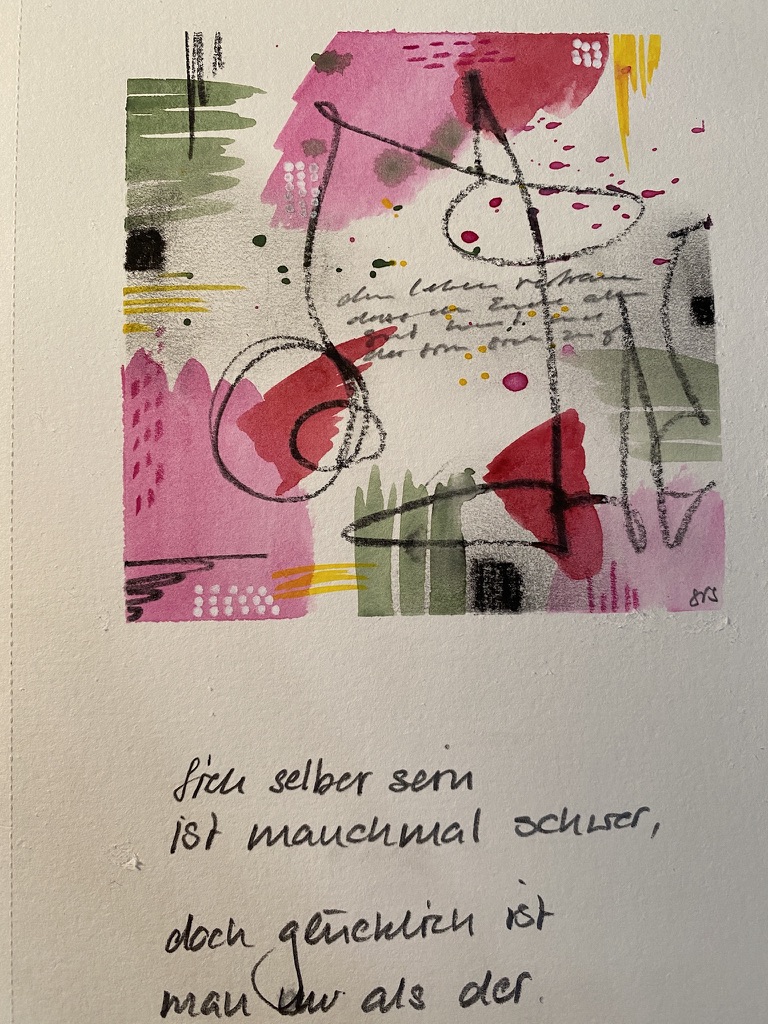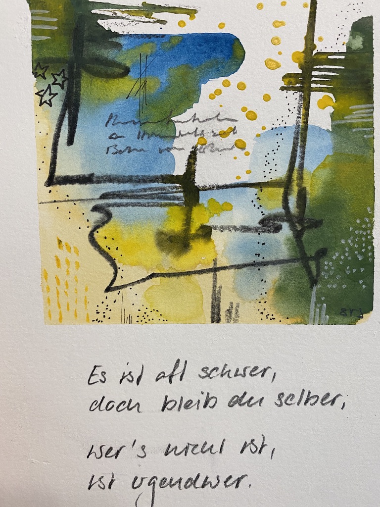 Ein melancholisches Gedicht, ein Liebesgedicht, aus dem viel Angst, Trauer und Einsamkeit spricht. Und doch auch ein tröstliches Gedicht für all die, welche genau das auch kennen und beim Lesen merken, dass sie nicht allein sind damit. Und oft braucht es auch einen Anstoss von aussen – zum Beispiel dieses Gedicht -, um das eigene Verhalten zu erkennen und es vielleicht auch ändern zu können. Man kann die Gedanken vielleicht nicht immer ganz ausschalten, aber gerade dann kann ein Mitteilen etwas (noch mehr) Verbindendes haben, das dann wiederum die Liebe zusätzlich stützt – und vielleicht dadurch auch die bösen Gedanken ausräumt.