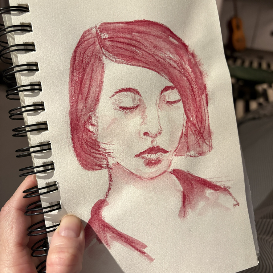 (im Bild: eine Skizze aus meiner neuen Reihe mit Porträts, Aquarellstift auf Papier)